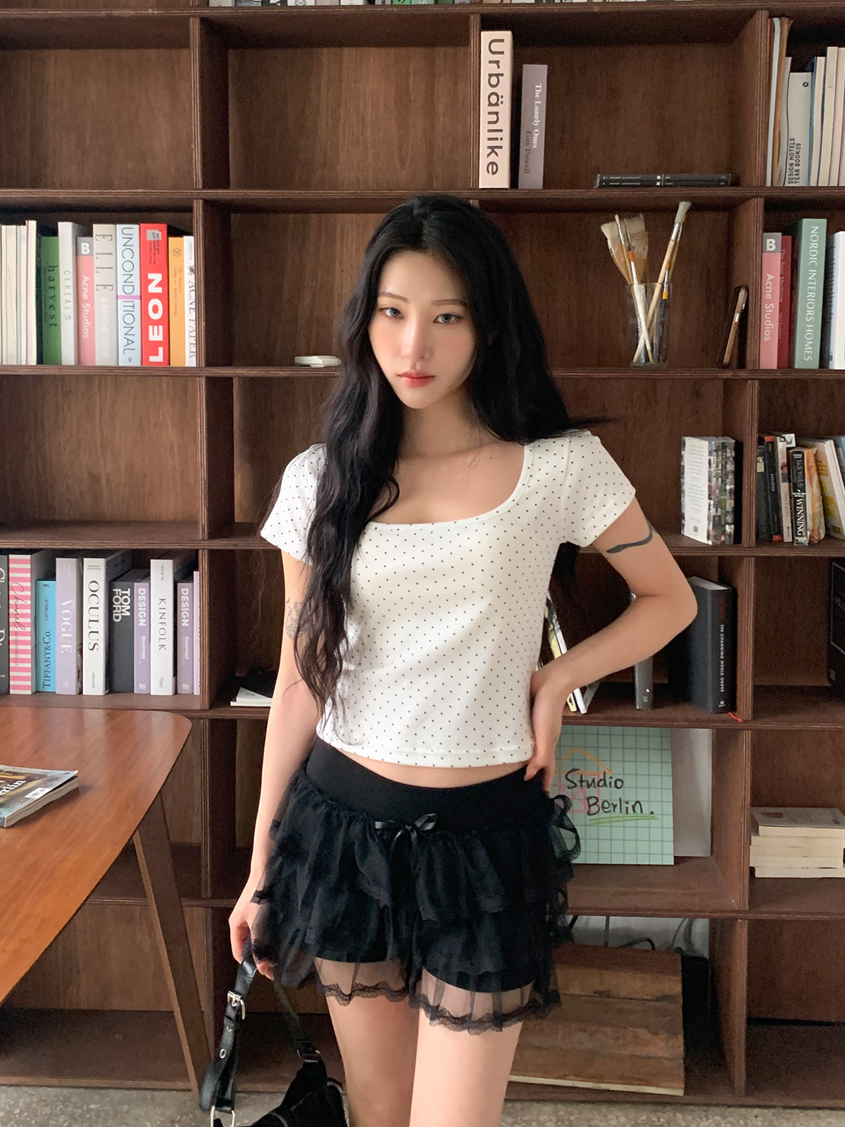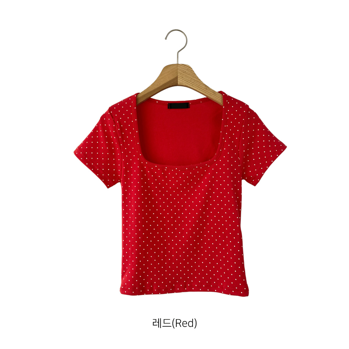 귀여운 도트 패턴과 탁 트인 스퀘어 넥이 포인트인 데일리 반팔 티셔츠